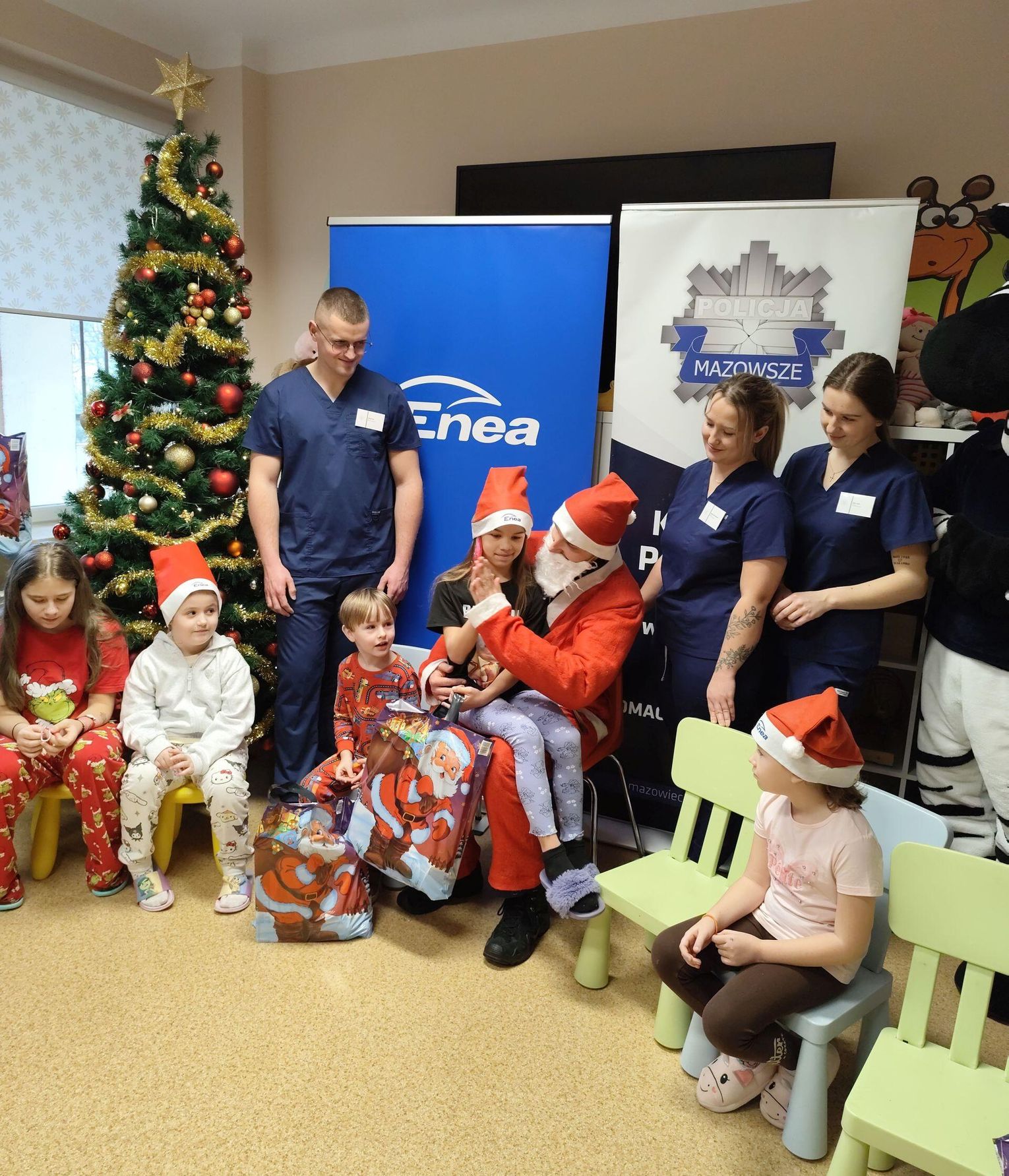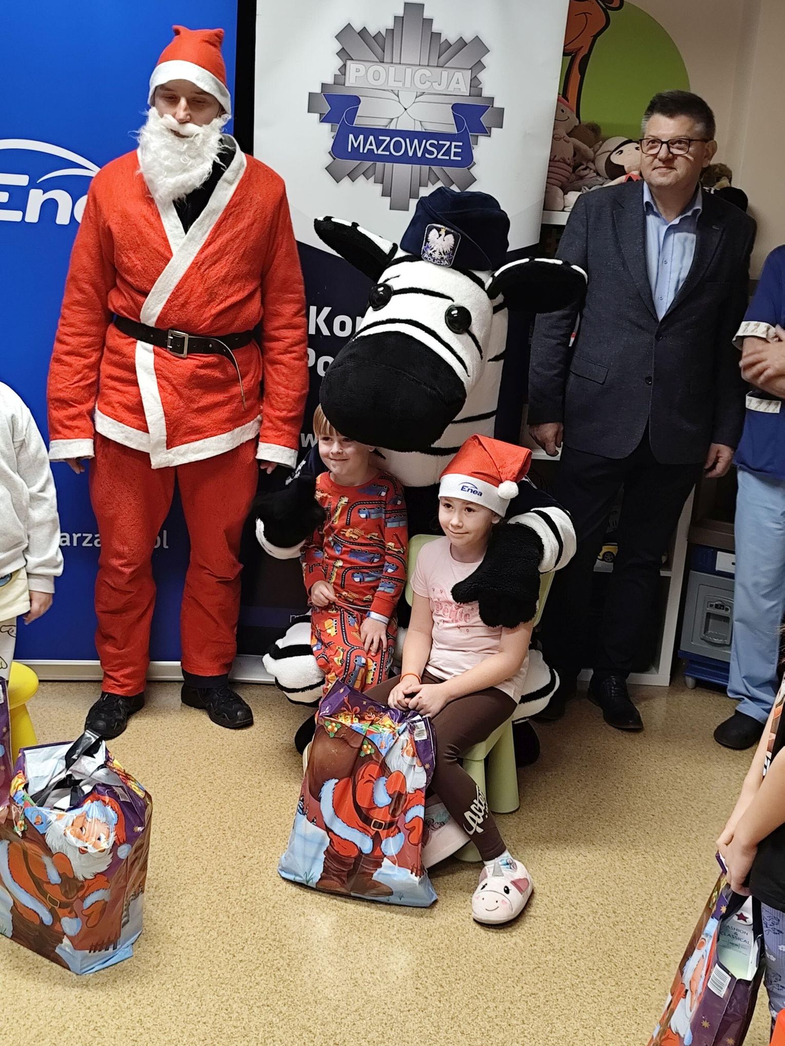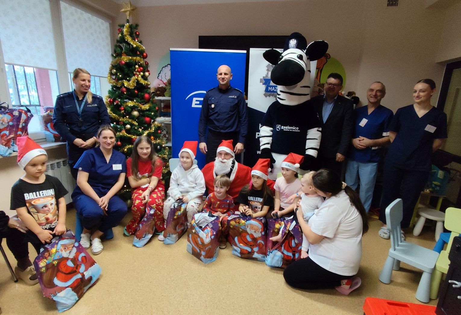 To już tradycja kiedy Mikołaj w asyście przedstawicieli Enei Wytwarzanie i funkcjonariuszy Komendy Powiatowej Policji w Kozienicach odwiedza małych pacjentów przebywających w kozienickim szpitalu. Tym razem w spotkaniu uczestniczyli także Sławomir Zielony, wiceprezes zarządu Enei Wytwarzanie i Wojciech Bednarski, Komendant Powiatowy Policji w Kozienicach oraz Czesław Czechyra, lekarz kierujący oddziałem wraz z personelem medycznym. Celem wizyty było wspólne spędzenie czasu z dziećmi, które w okresie Mikołajek musiały przebywać w szpitalu oraz obdarowanie ich prezentami. W tym roku Święty Mikołaj pojawił się również w towarzystwie policyjnej maskotki – zebry, Komisarza Ziko, która od pierwszych chwil wzbudziła u najmłodszych ogromną radość i ciekawość.