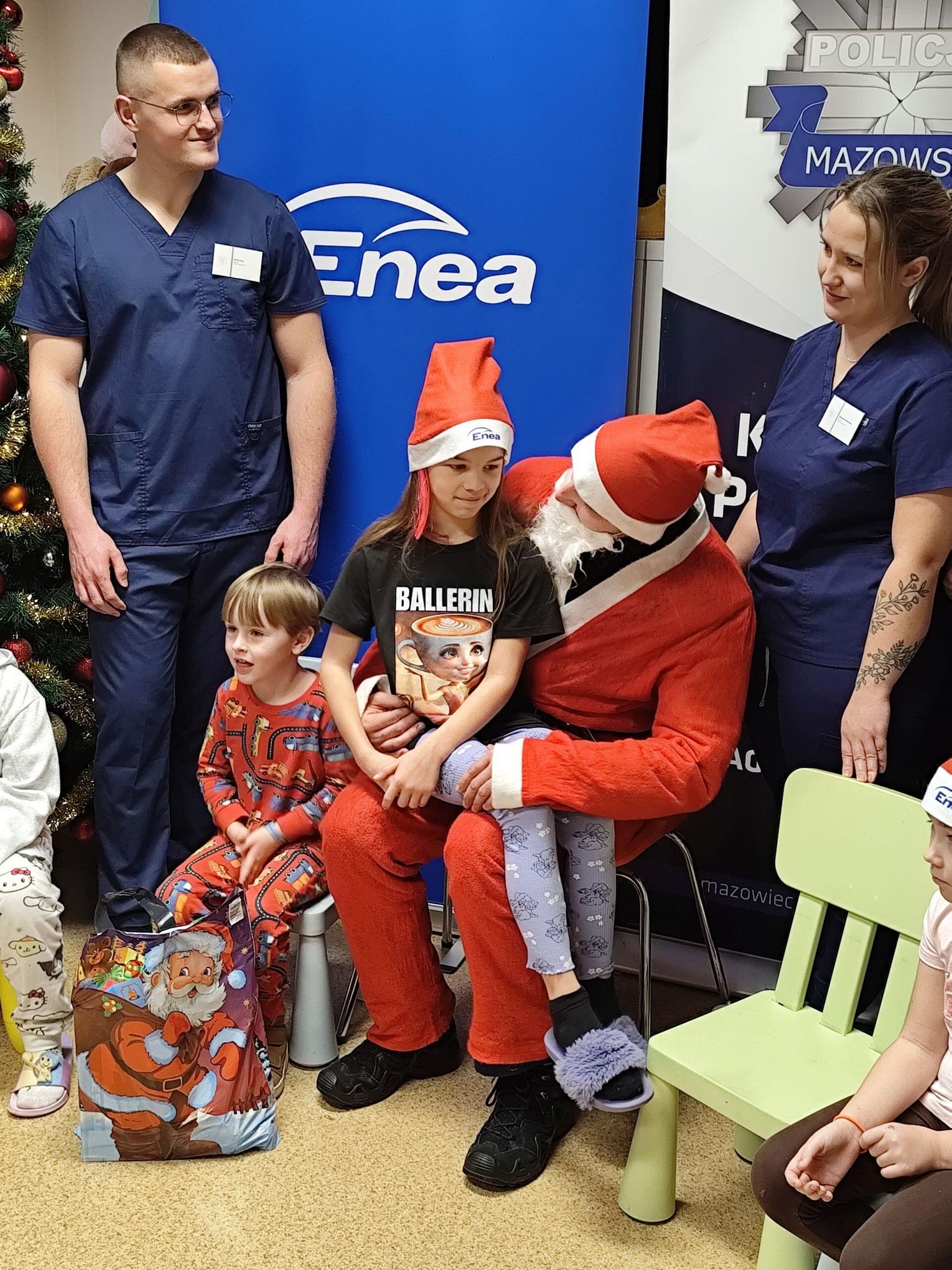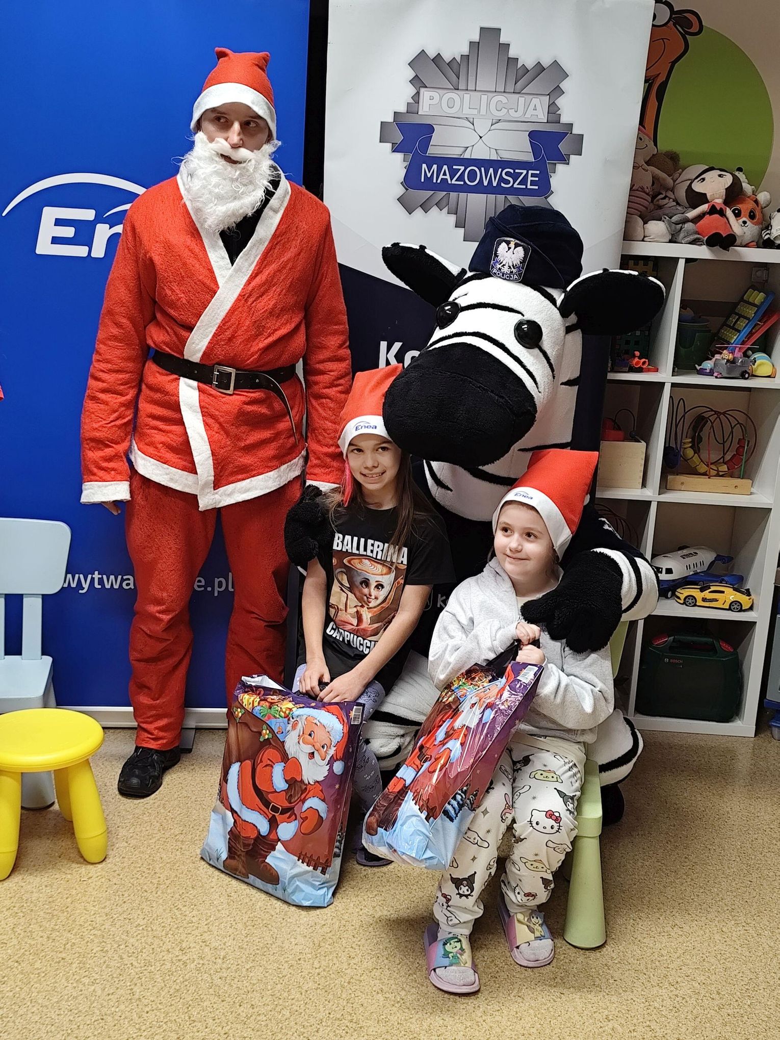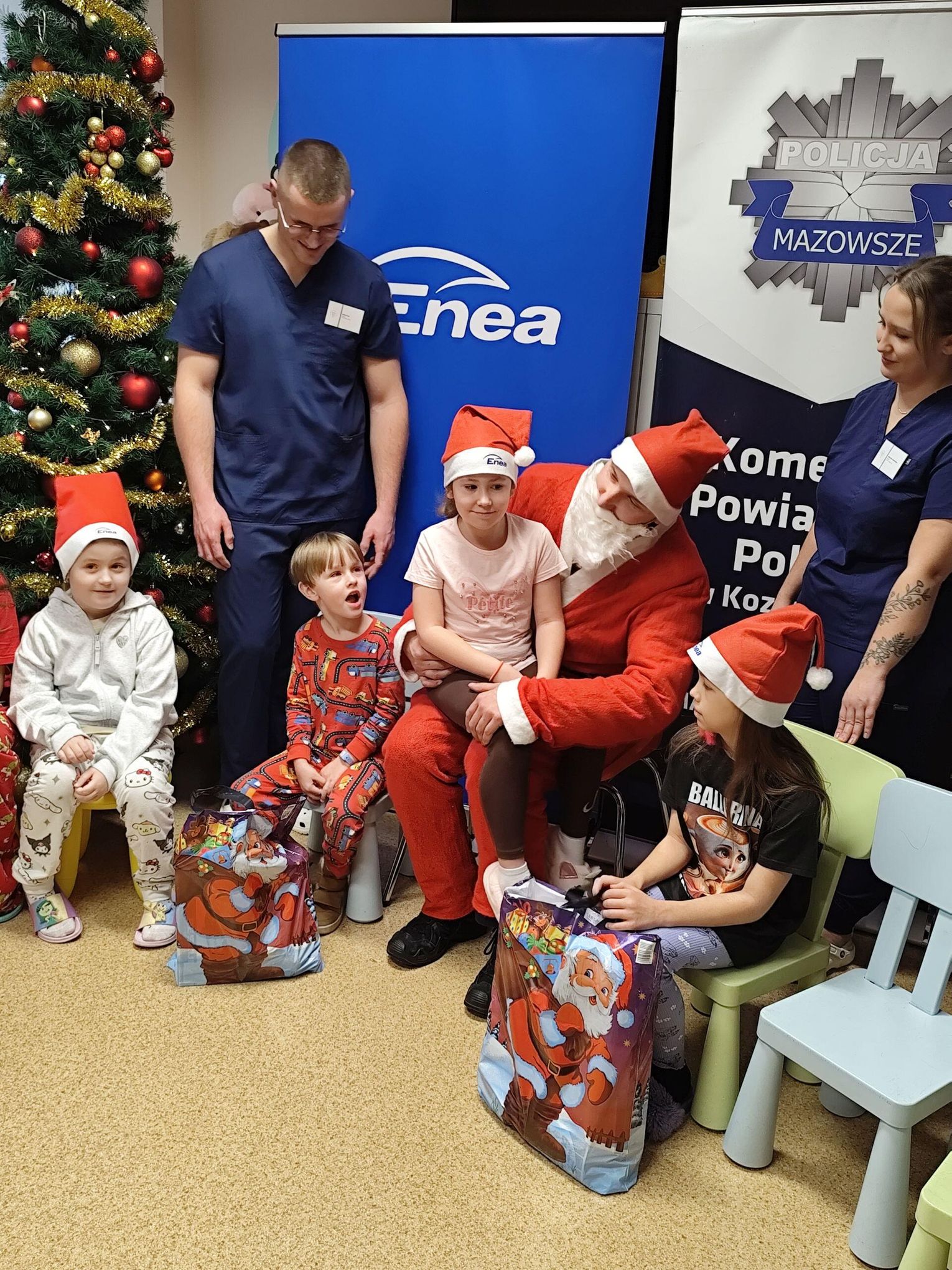 To już tradycja kiedy Mikołaj w asyście przedstawicieli Enei Wytwarzanie i funkcjonariuszy Komendy Powiatowej Policji w Kozienicach odwiedza małych pacjentów przebywających w kozienickim szpitalu. Tym razem w spotkaniu uczestniczyli także Sławomir Zielony, wiceprezes zarządu Enei Wytwarzanie i Wojciech Bednarski, Komendant Powiatowy Policji w Kozienicach oraz Czesław Czechyra, lekarz kierujący oddziałem wraz z personelem medycznym. Celem wizyty było wspólne spędzenie czasu z dziećmi, które w okresie Mikołajek musiały przebywać w szpitalu oraz obdarowanie ich prezentami. W tym roku Święty Mikołaj pojawił się również w towarzystwie policyjnej maskotki – zebry, Komisarza Ziko, która od pierwszych chwil wzbudziła u najmłodszych ogromną radość i ciekawość.